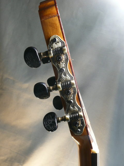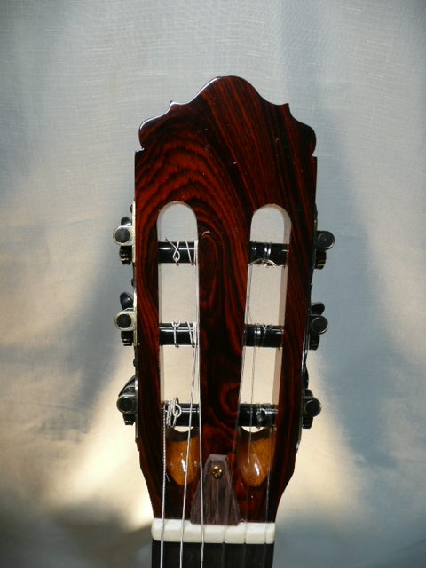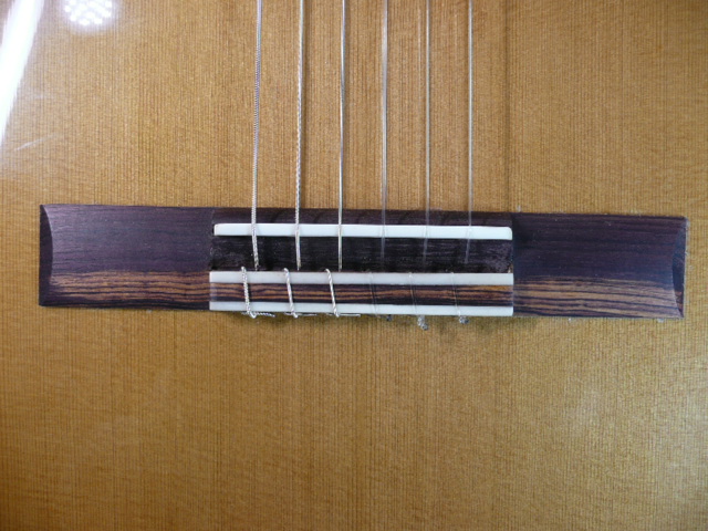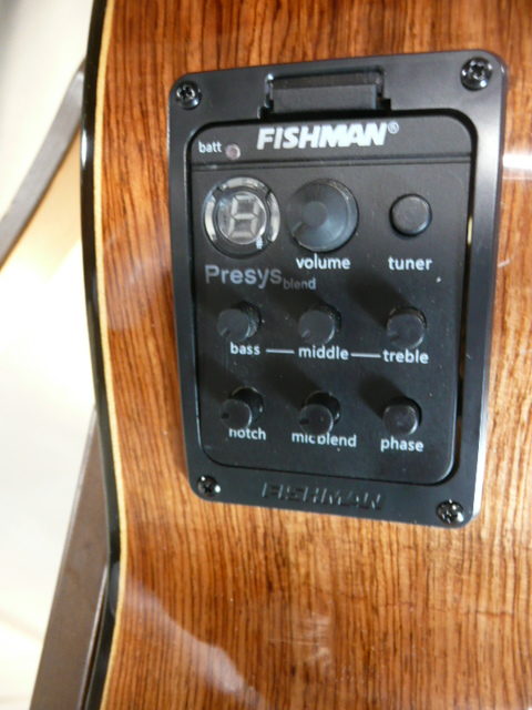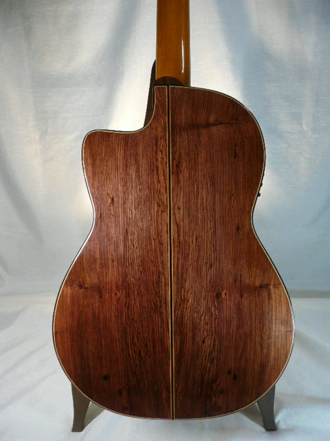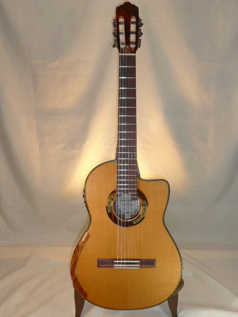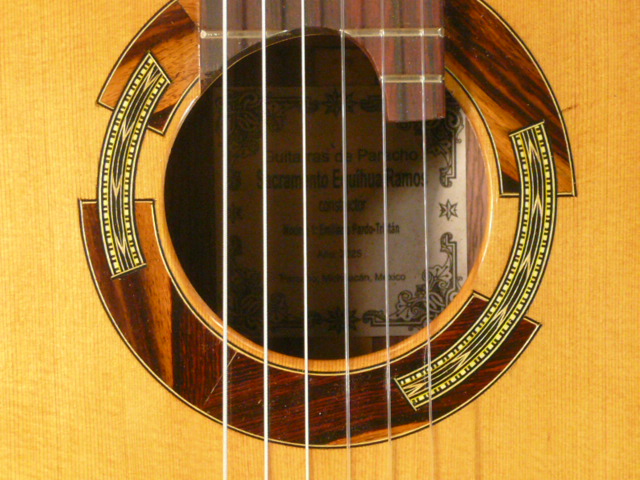 Paracho, 2025.  Solid cedar soundboard, seven fan braces, figured Palo Escrito rosewood back and sides, 650 mm scale, 51 mm nut width, truss rod, cutaway, armrest, 12 hole tie block, 20th fret, Fishman 9v battery powered pickup, piezo plus onboard mic with blend control, and tuner.  Sacramento is one of the leading luthiers in Paracho, the home of generations of guitar makers since Spanish colonial times.  As seen in this instrument, he has easily kept up with the latest developments in classical guitar construction. Being handmade, this instrument has an excellent acoustic voice with very good projection, acoustically well suited for smaller venues, and then plugged in for gigs.  The Fishman amplification has a wide range of adjustment to meet all needs.  A great natural sound acoustically, as well as plugged in.