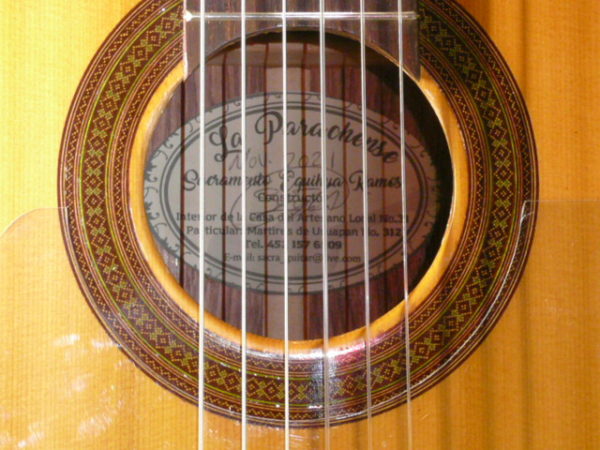 2021, Paracho, Mexico. Solid cedar 5 fan braced soundboard, solid figured palo escrito back and sides, 650 mm scale, 51 mm nut width, truss rod, 7th fret position marker, 12 hole tieblock, full golpeador, lacquer finish. How can a guitar have all of the above features at this price point? It certainly does, and with a sound that makes it all worthwhile. Beginners and intermediate players can be musically expressive with this instrument. Lutherie in Paracho dates back to the 18th century and as the features of this instrument demonstrate, Sr. Ramos is keeping up with the latest developments. Foam core case included.